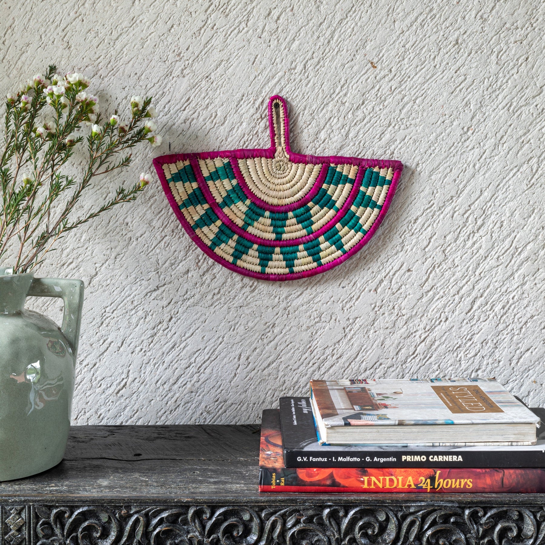 Emerald and Pink Trikon Handwoven Sabai Grass Fan-Sabai baskets-House of Ekam