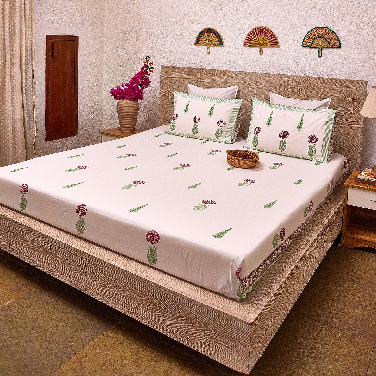 Crafted from 220 thread count cotton, the fabric is exceptionally soft and breathable, making it a pleasure to sleep on while remaining durable for everyday use. The collection includes block-printed bedsheets paired with cotton slub curtains, whose gentle texture adds depth and an easy, relaxed drape to the room.
