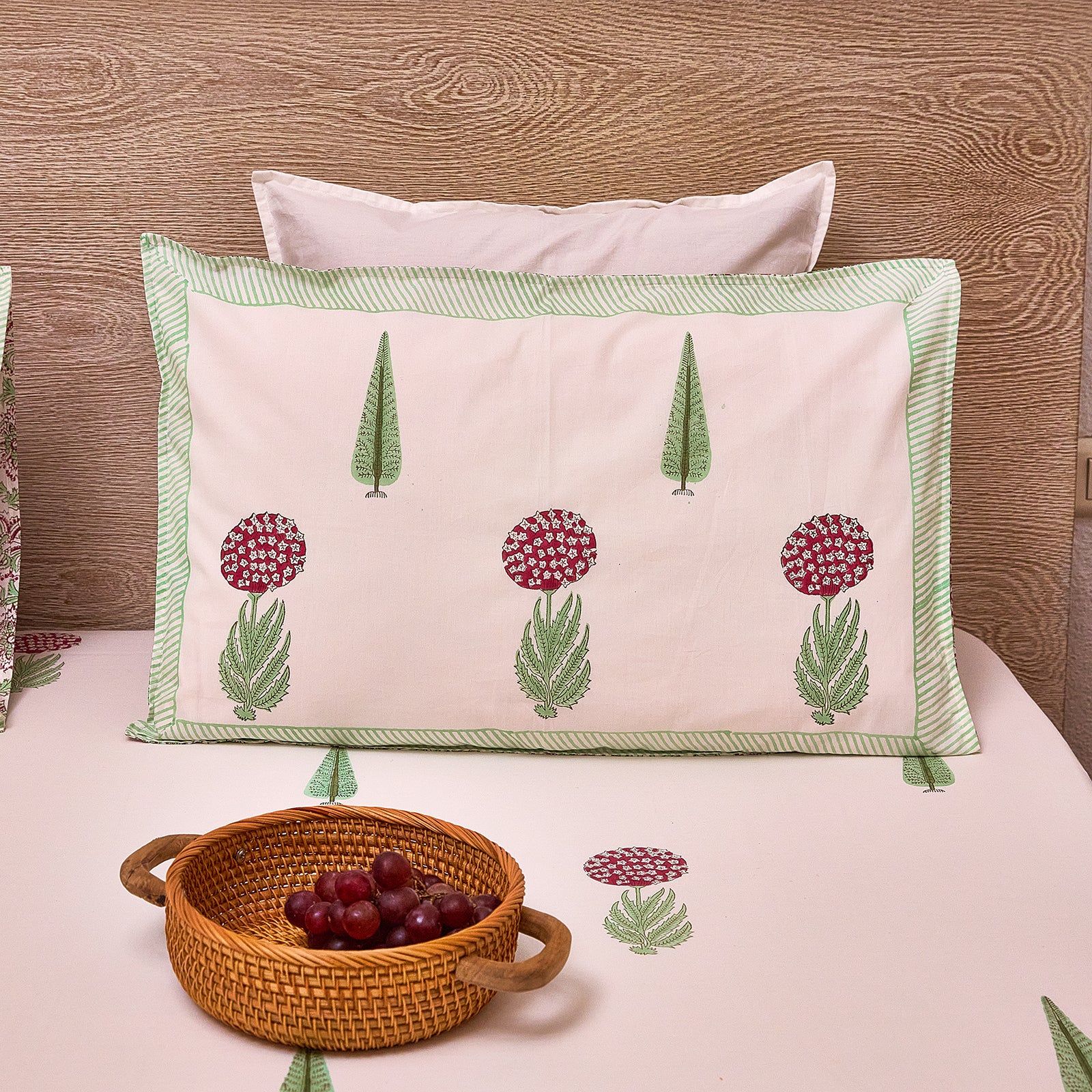 Rooted in timeless florals and rich colour, the Gul Collection celebrates the beauty of handcraft and comfort. Featuring red hydrangea–inspired blooms paired with graceful green cypress motifs, the designs are hand block-printed in deep yet balanced hues of red and green, bringing warmth and character to the space.