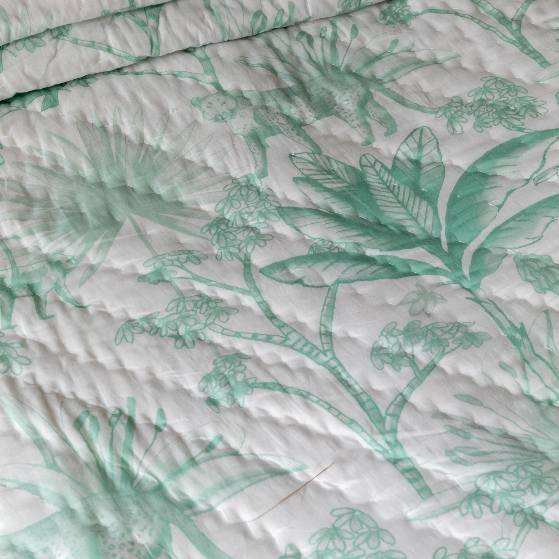 The Green Palm Tropicasa Quilt blends hand-drawn palm artistry with soothing green hues to create a relaxed, boho-luxe vibe. Lightweight and beautifully crafted, it pairs perfectly with cushions and bedsheets from the Tropicasa Collection for a harmonious tropical look.