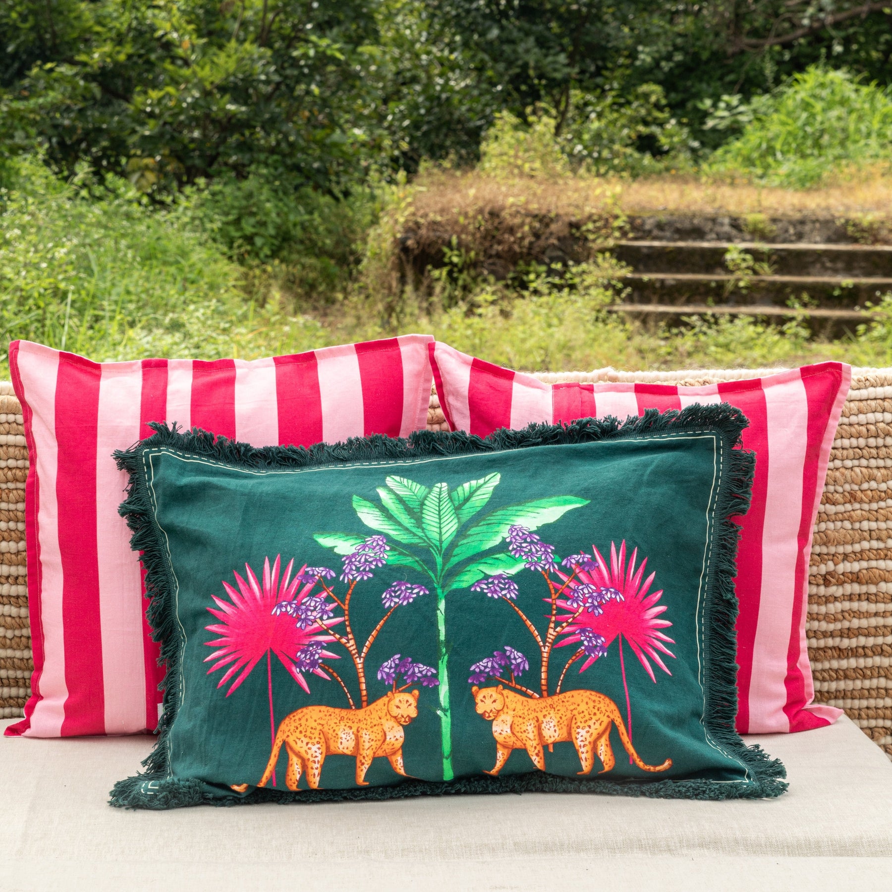 Step into a dreamy tropical world with our new Tropicasa Collection. Hand sketched entirely and painted with mystic palms, wild banaans, a serene blooming lotus, and a curious toucan perched amid it all, each piece feels like a handwoven story from a faraway island. Touches of pink palms add that boho perfect pop for homes that love colour, craft, and carefree charm.