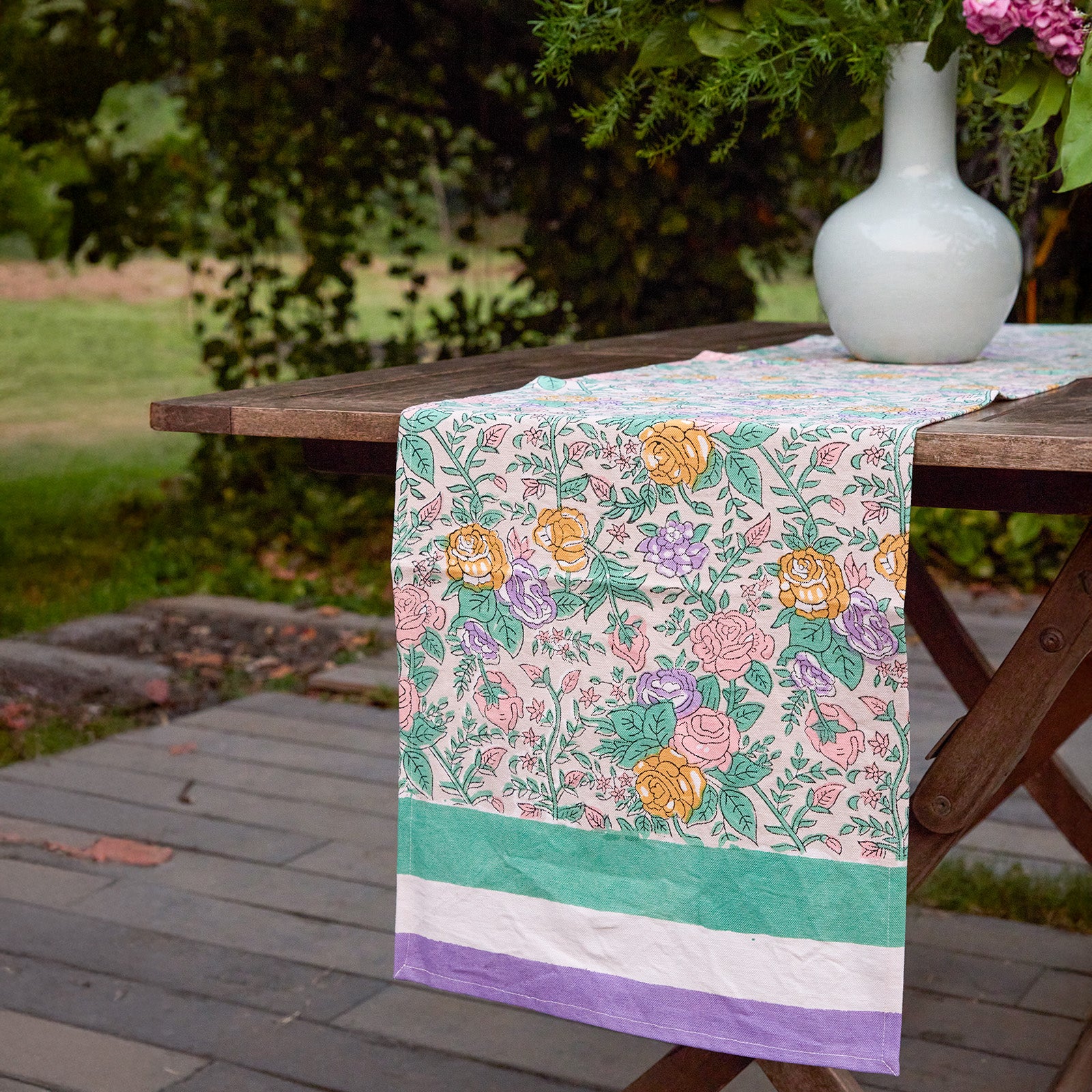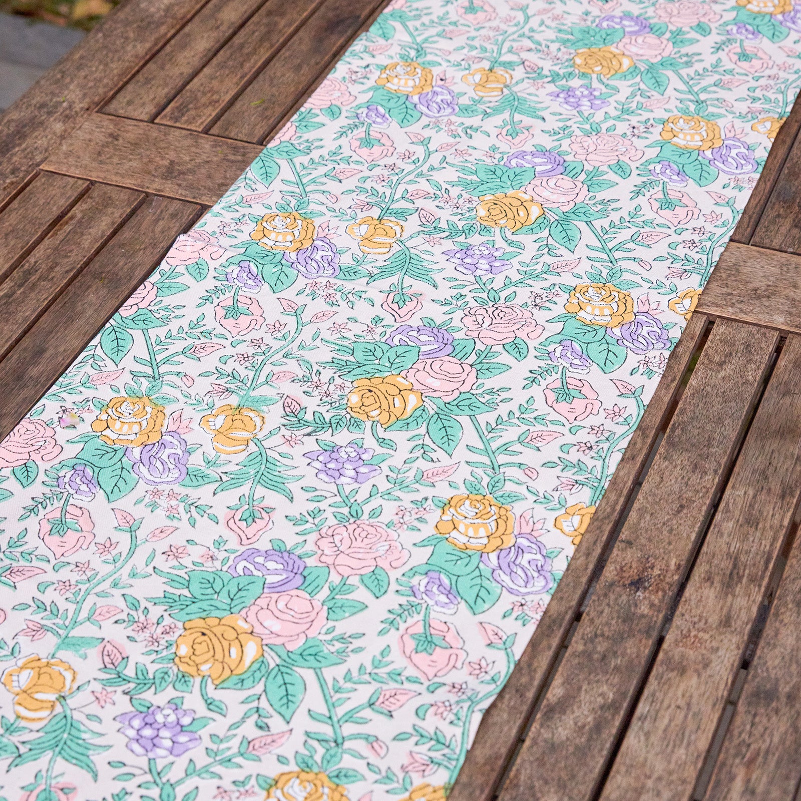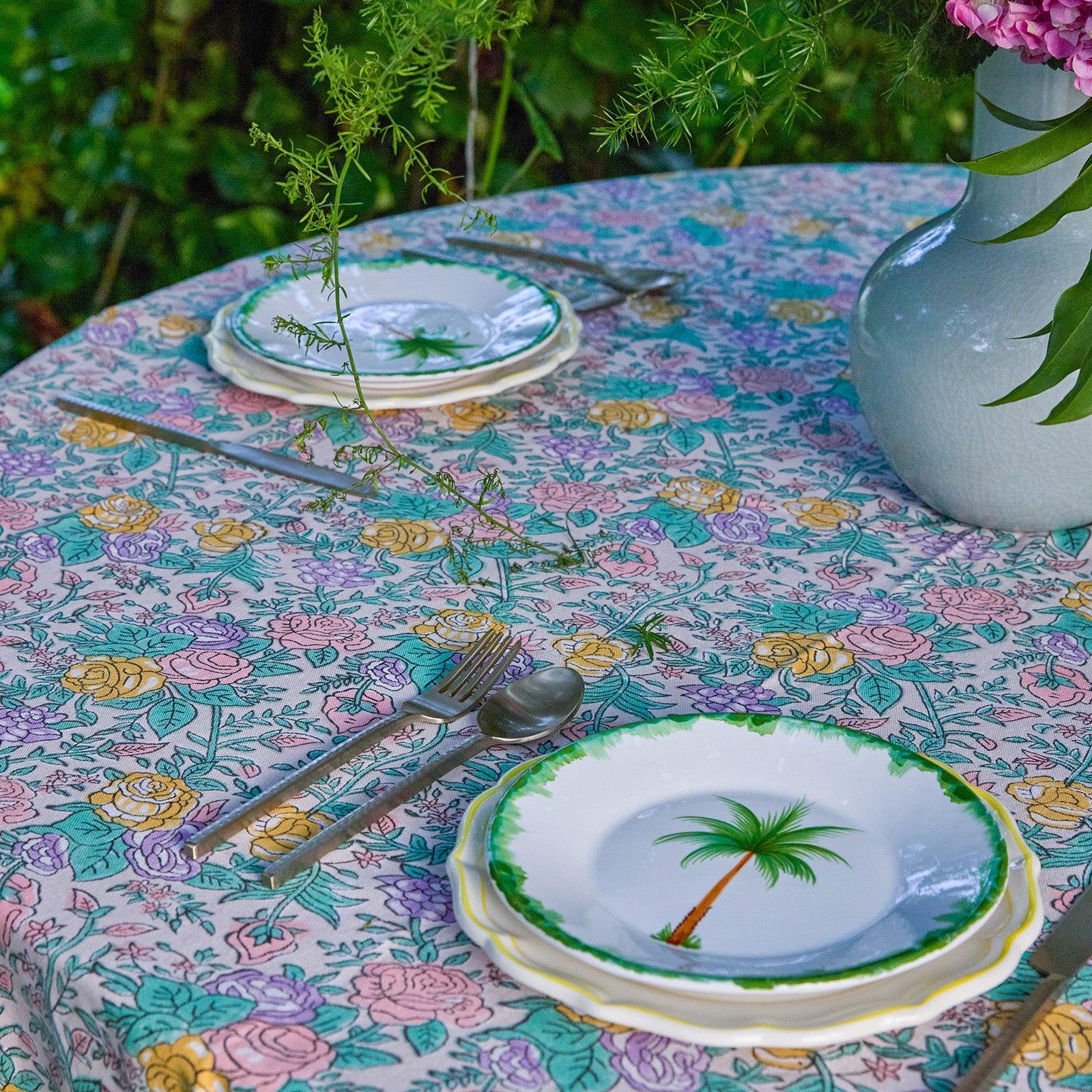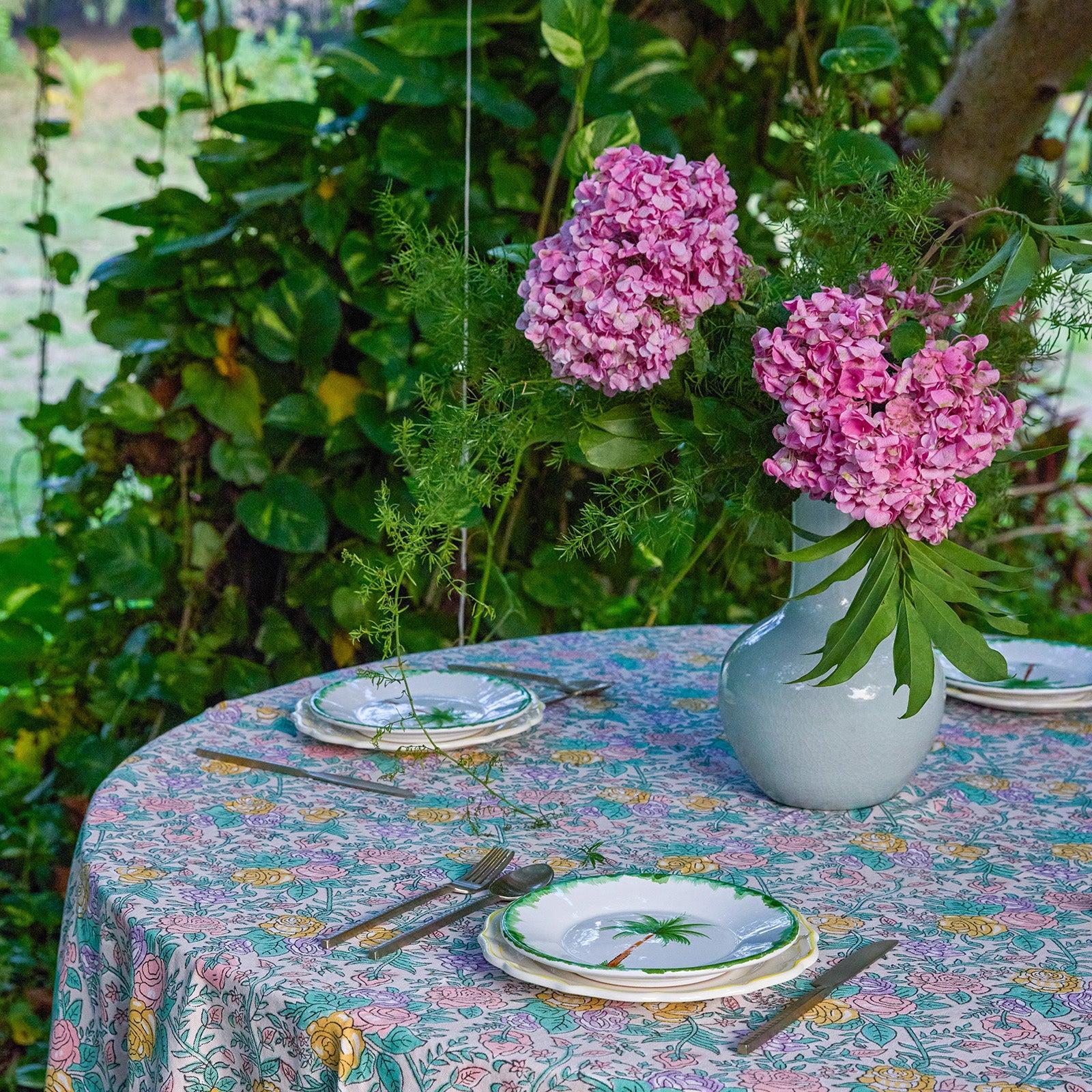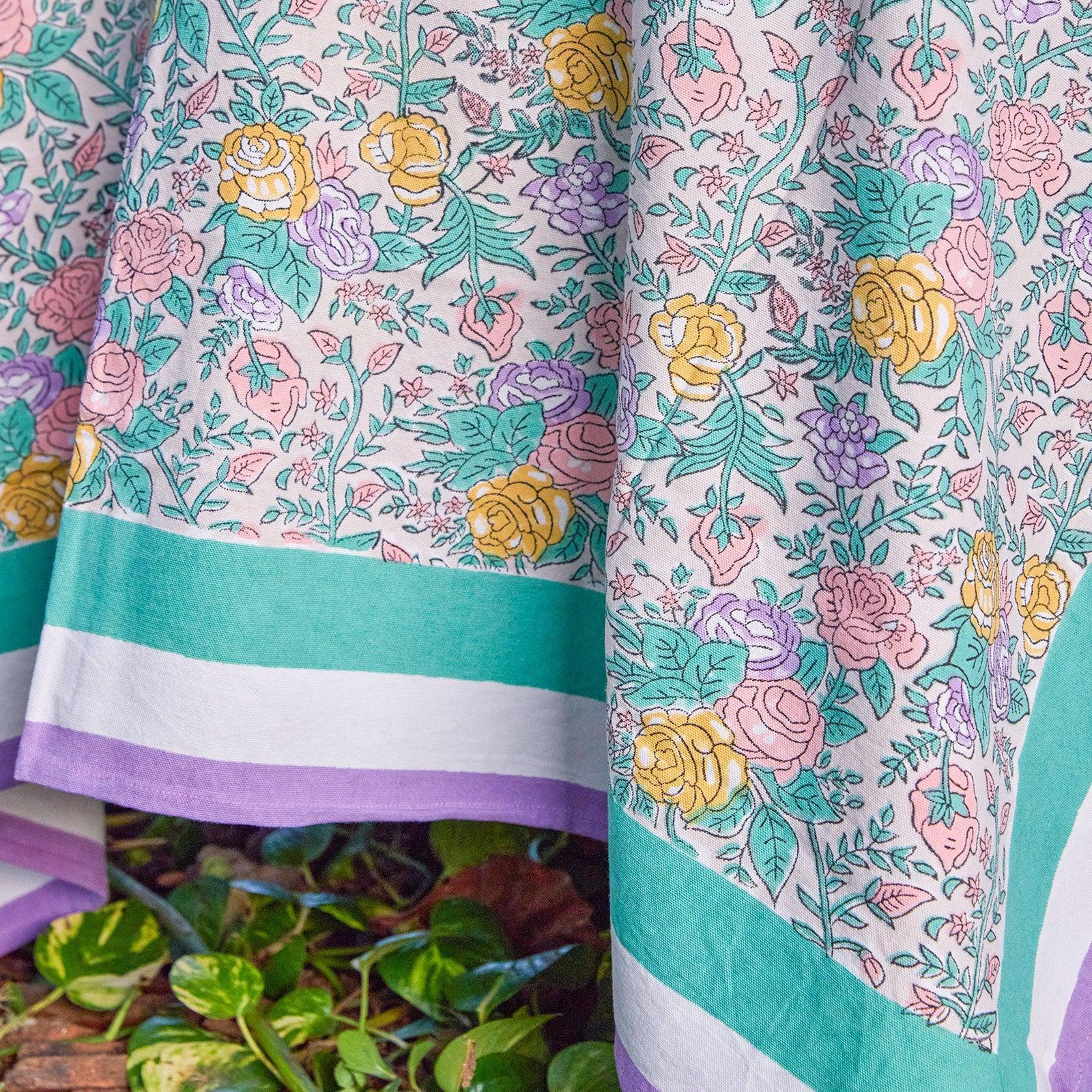 Bring a touch of old-world romance to your table with our Pink & Green Rose Tablecloth, inspired by the timeless beauty of English rose gardens. Delicately hand block-printed, the floral motifs bloom in soft pastel pinks and gentle greens, creating an elegant yet soothing palette that elevates everyday dining and special gatherings alike.