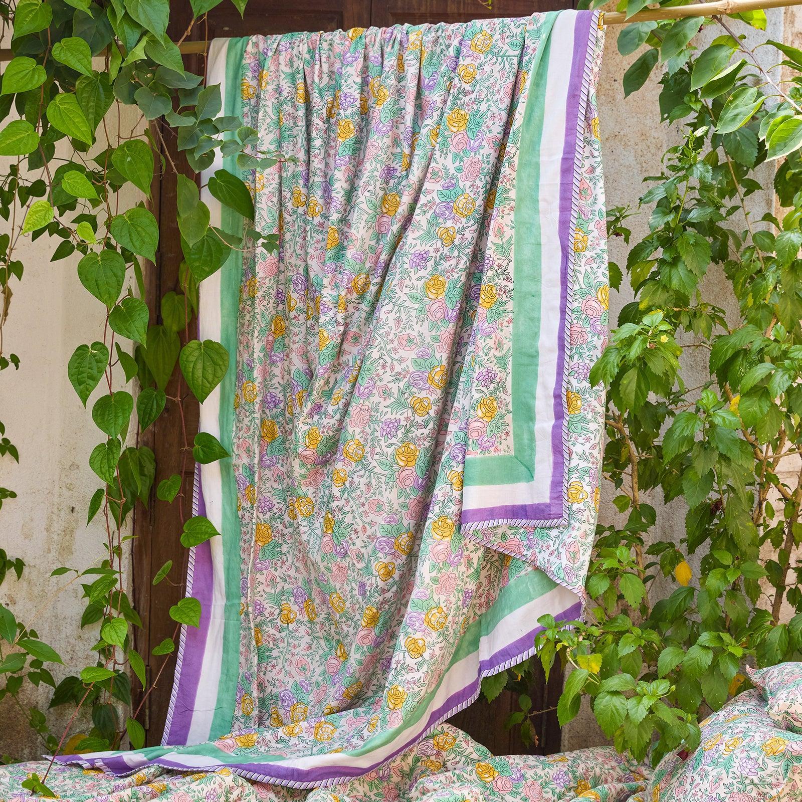 Bring a touch of old-world romance to your table with our Pink & Green Rose Dohar, inspired by the timeless beauty of English rose gardens. Delicately hand block-printed, the floral motifs bloom in soft pastel pinks and gentle greens, creating an elegant yet soothing palette that elevates your bed in ways more than one.