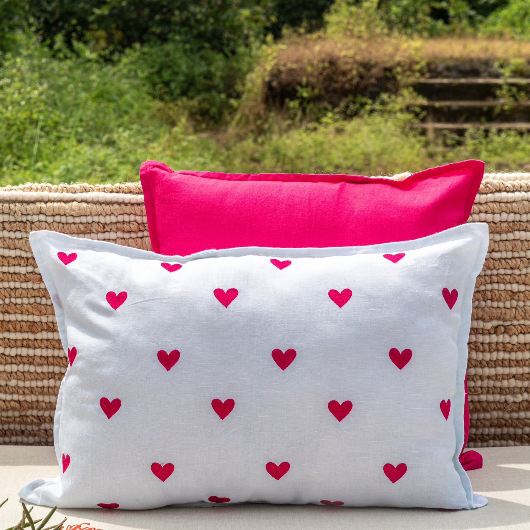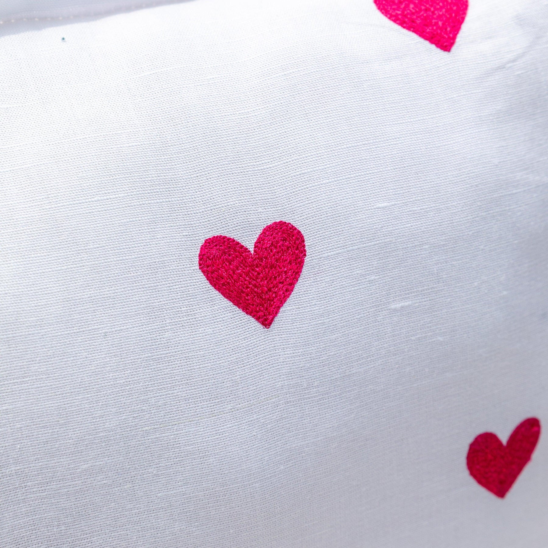 Bright, fun, and full of personality—the red heart embroidery on pure white fabric brings a joyful touch to any corner. A lovely complement to the bold palms and toucans of the Tropicasa Collection.