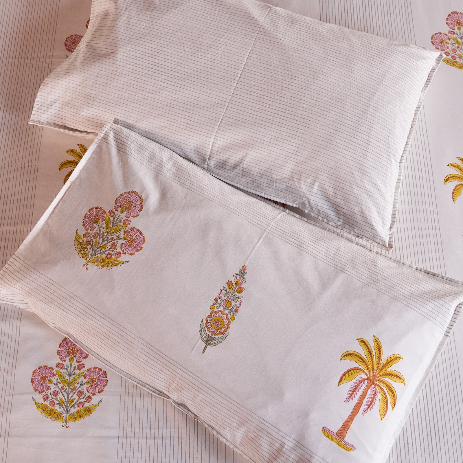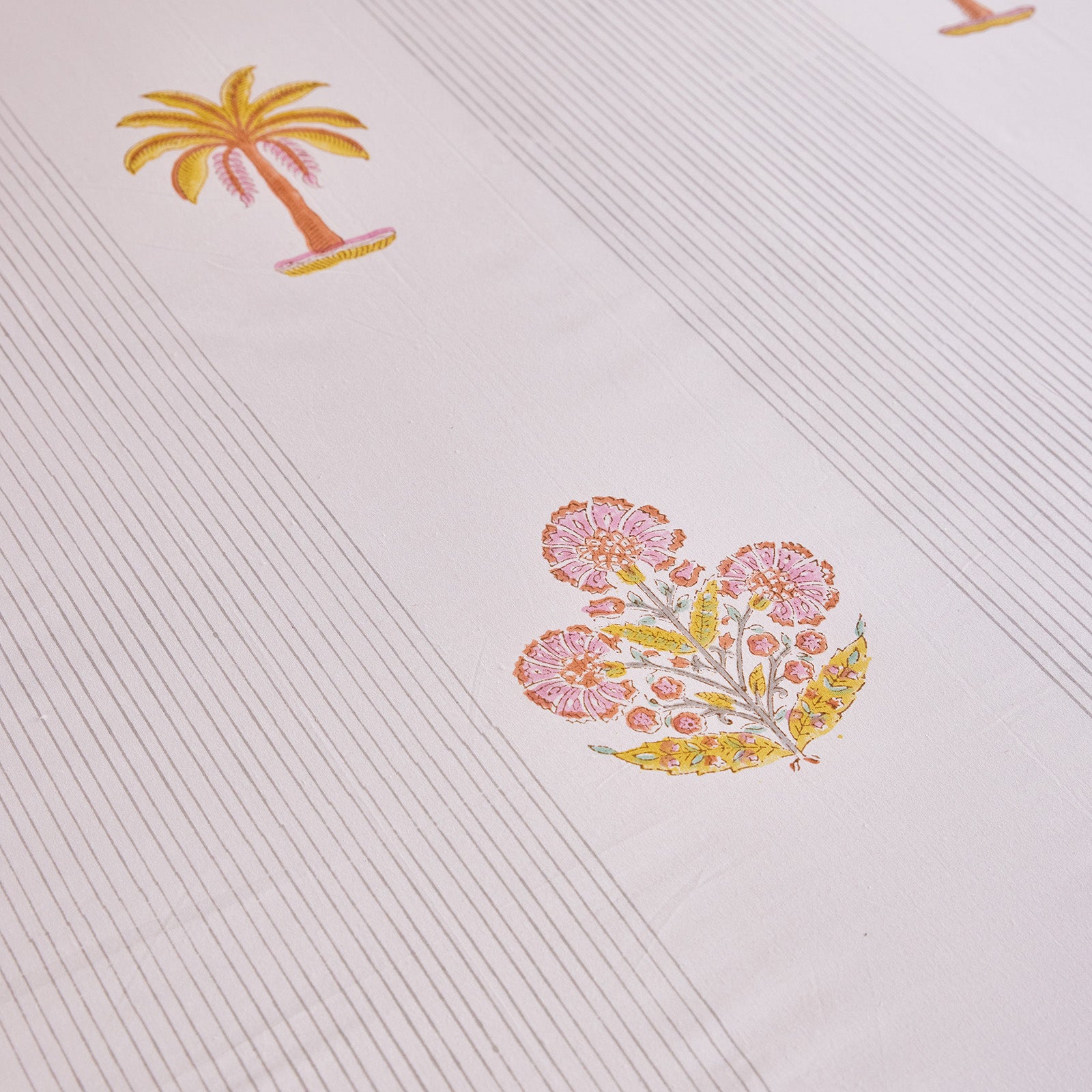 Rendered in beautiful hues of yellow and pink, the palette feels warm, joyful, and softly nostalgic, like early mornings by the sea and flowering courtyards washed in sunlight. Each piece is hand block-printed on 100% cotton, celebrating the rhythm, patience, and artistry of traditional craft.