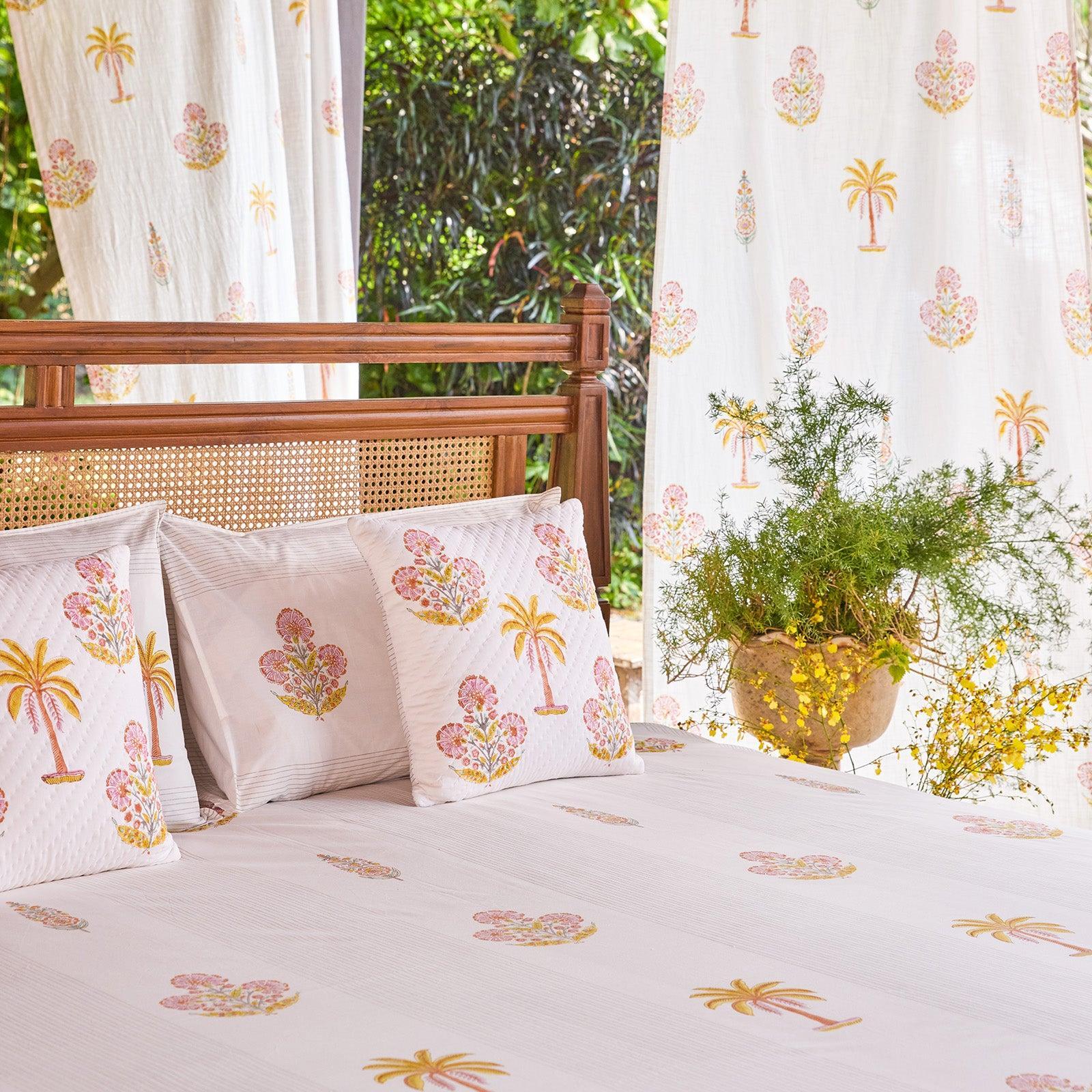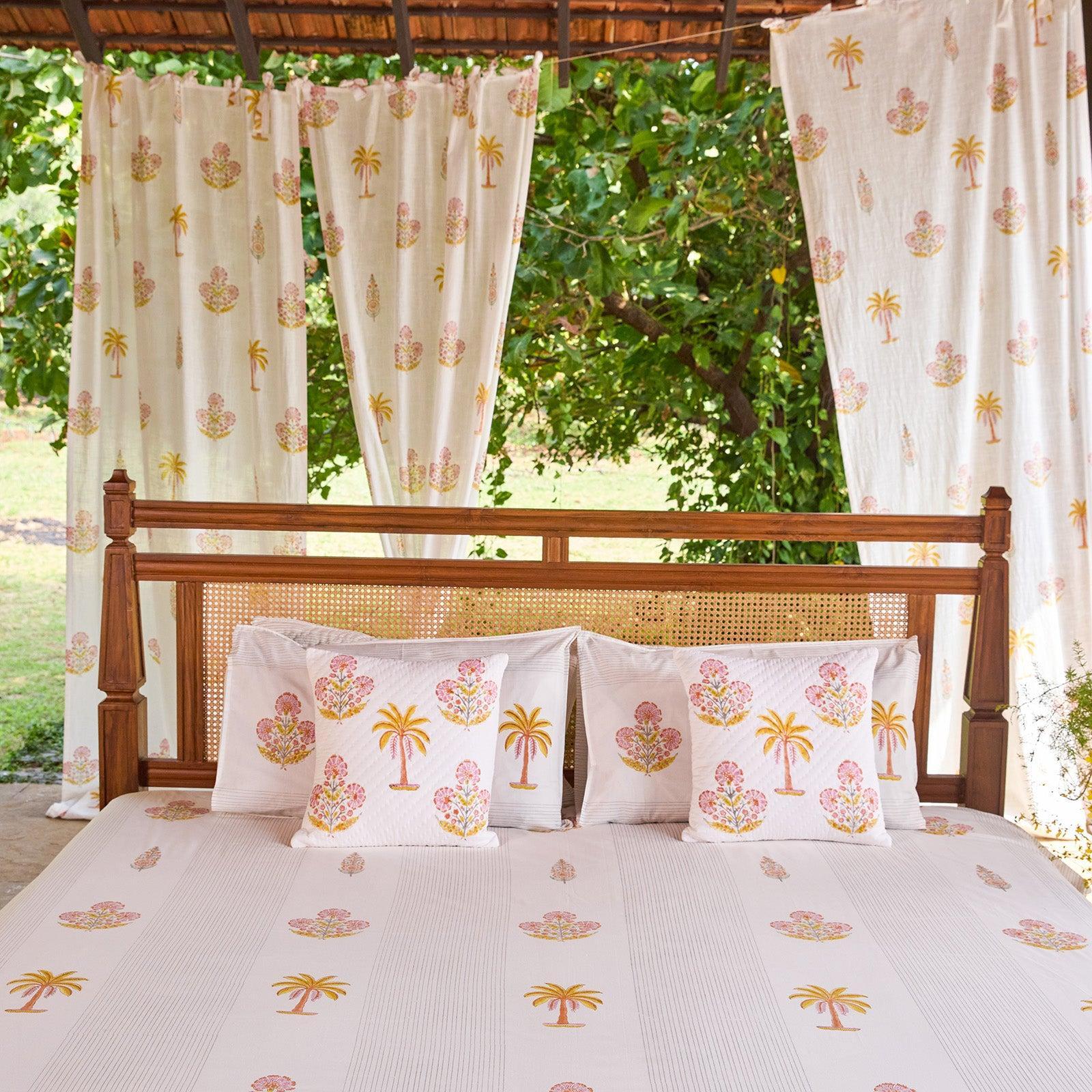 The Malabar Collection extends across bedsheets, quilts, cushions, curtains, bathrobes, and table linen, allowing the story to flow seamlessly through your home, from bedroom to bath to dining.