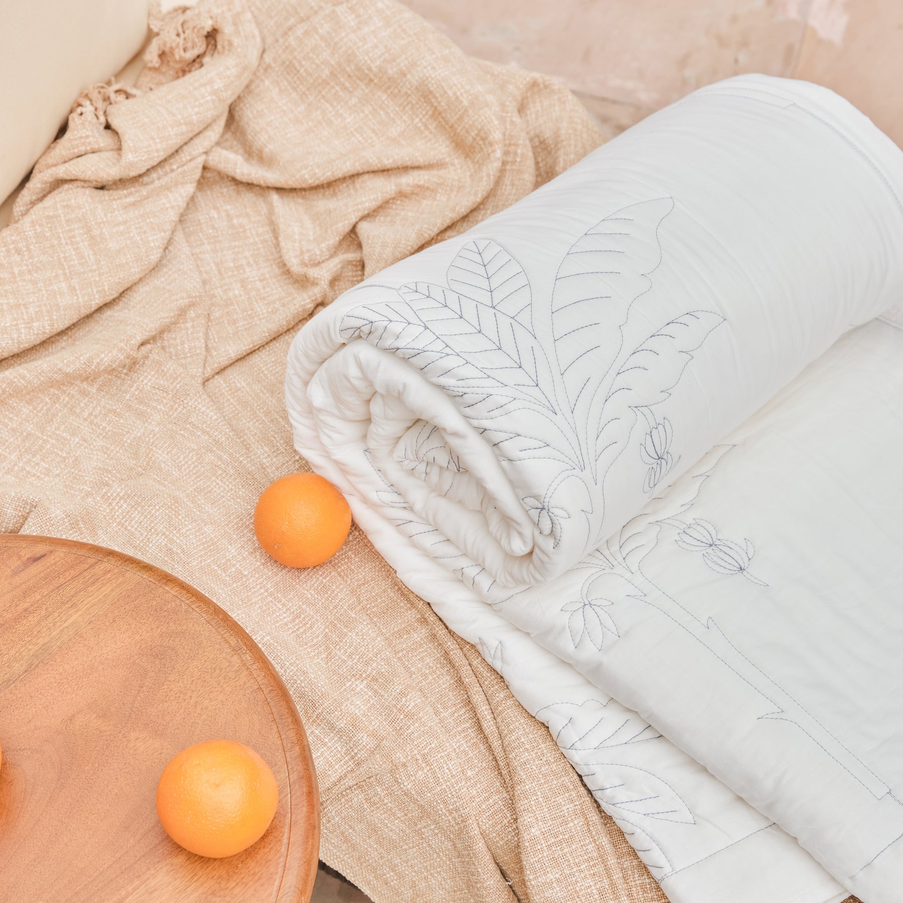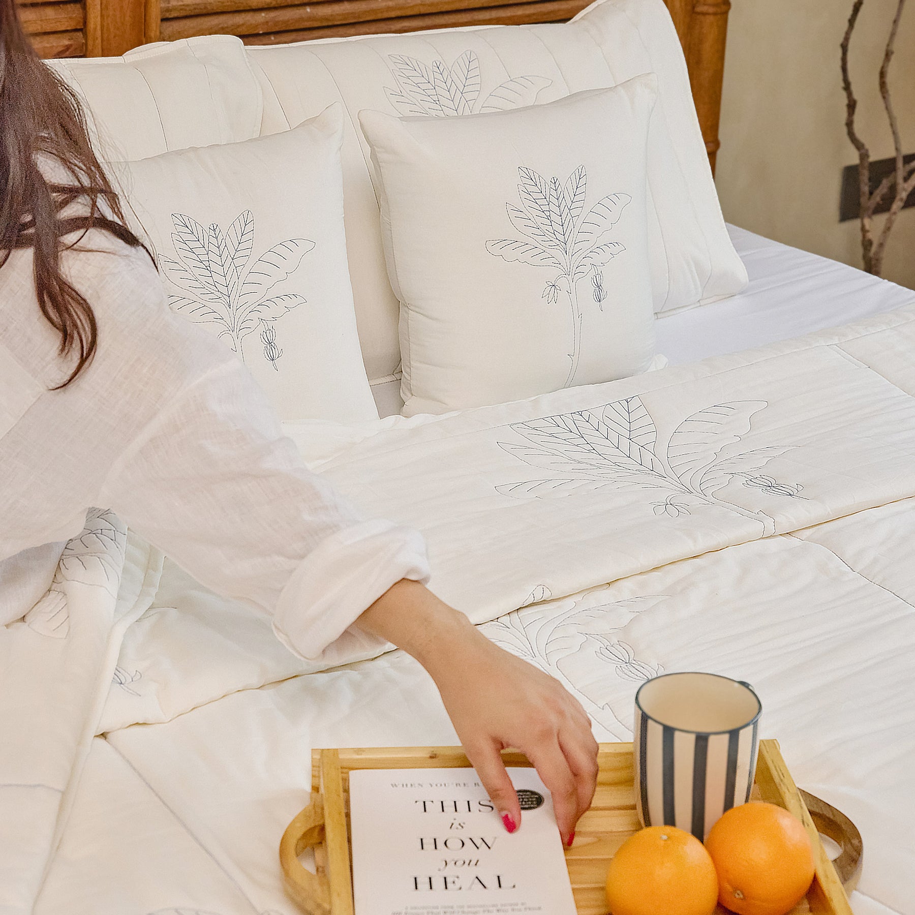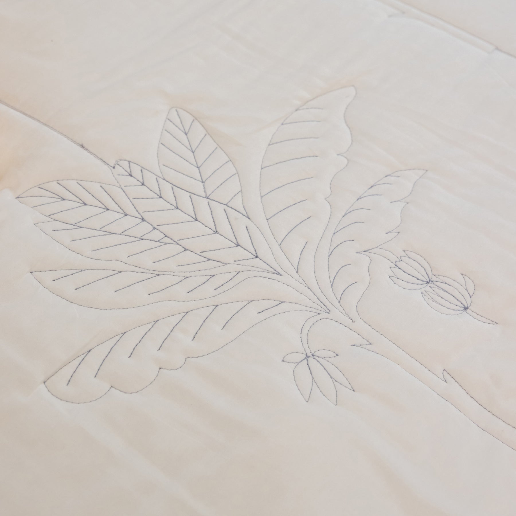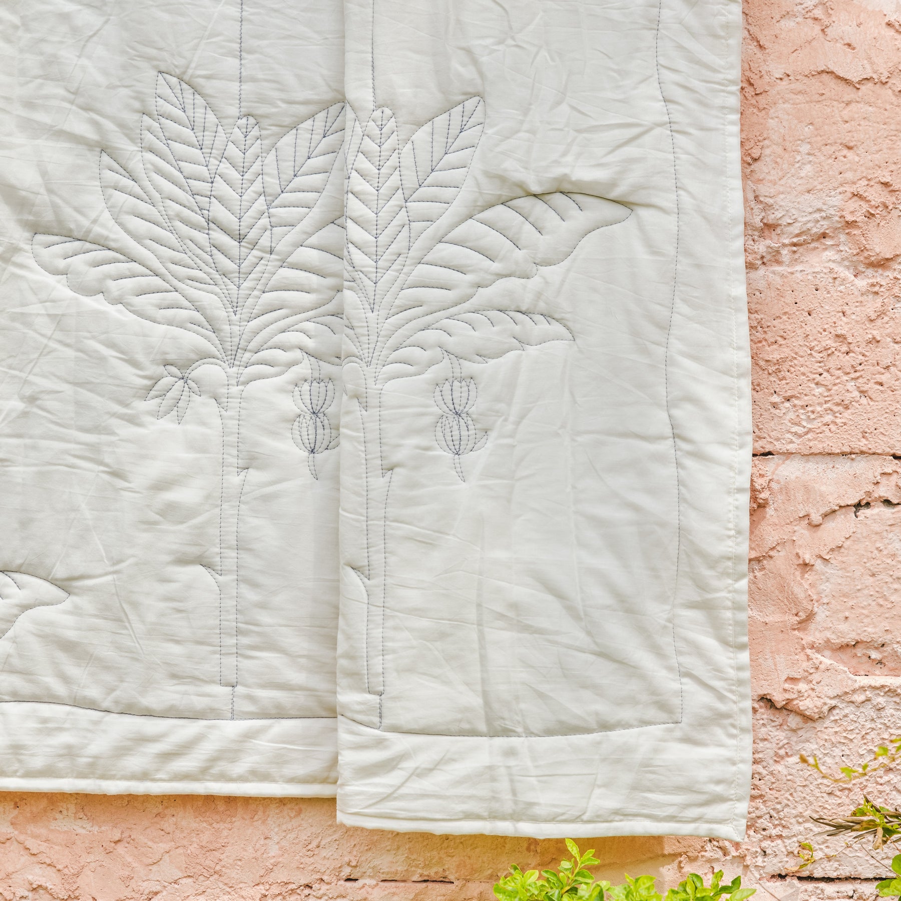 Quilts are a labour of love. Introducing brand new designs in our most favourite form of quilting. The tropical palm design has been hand sketched completely by our lead designer and then embroidered using soft quilting technique.