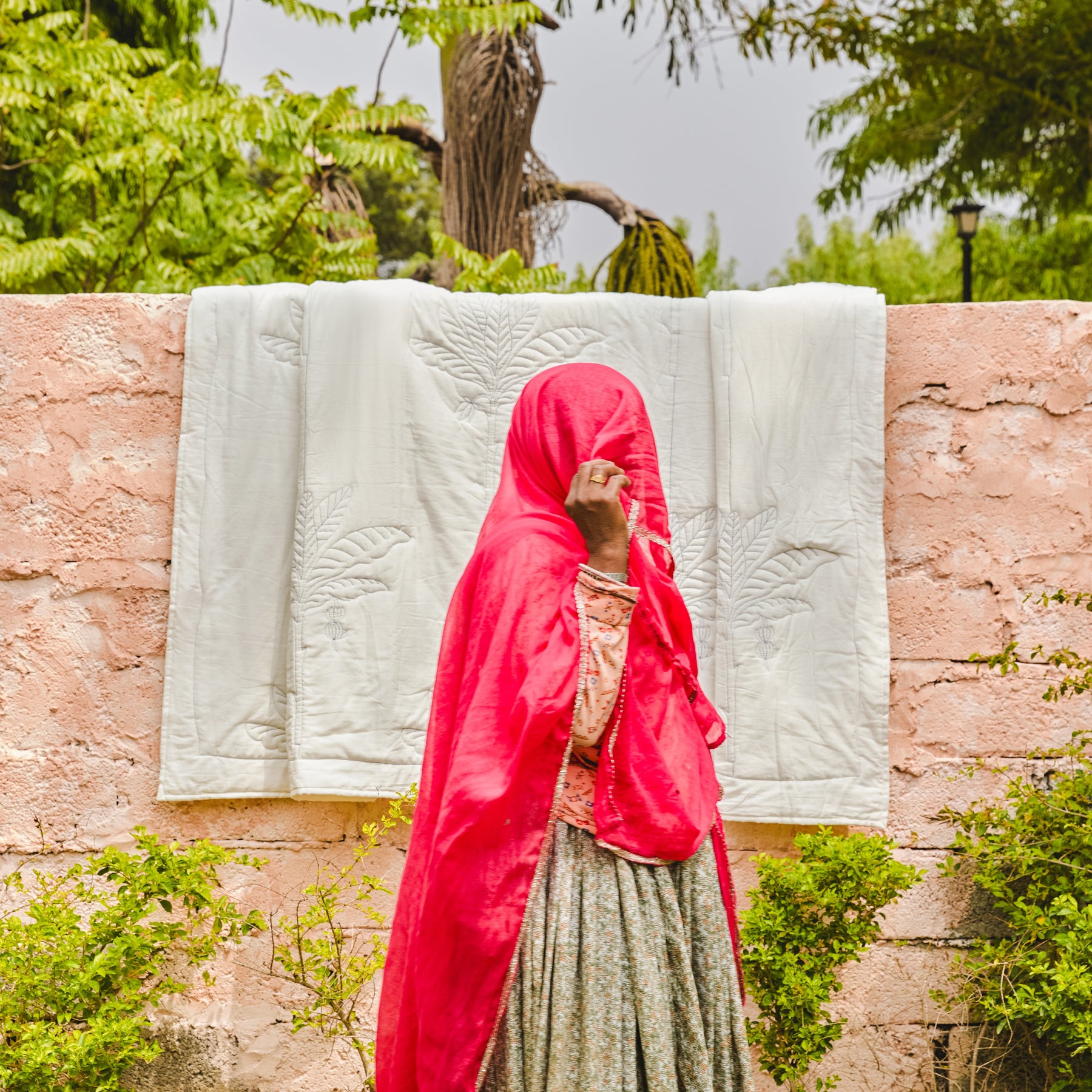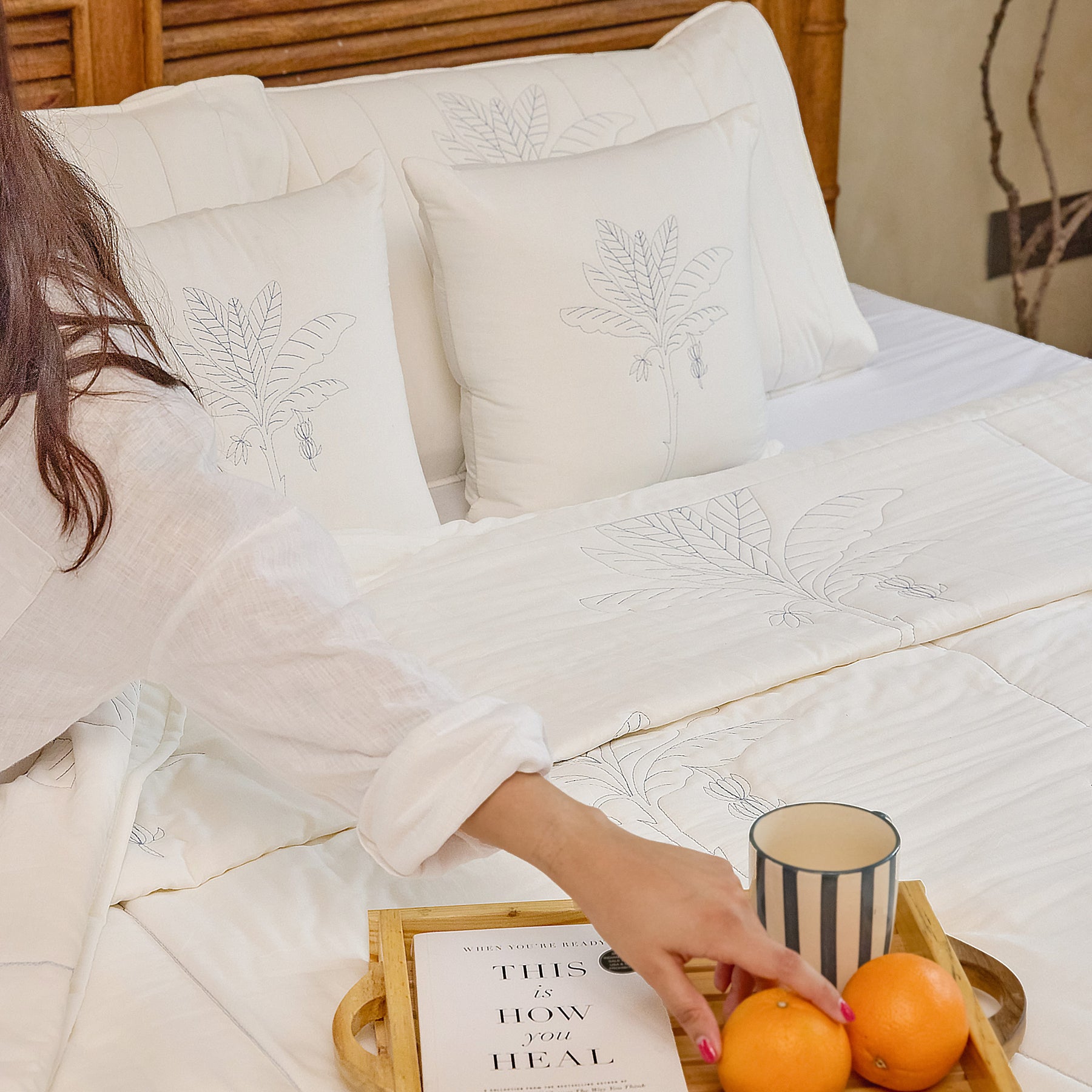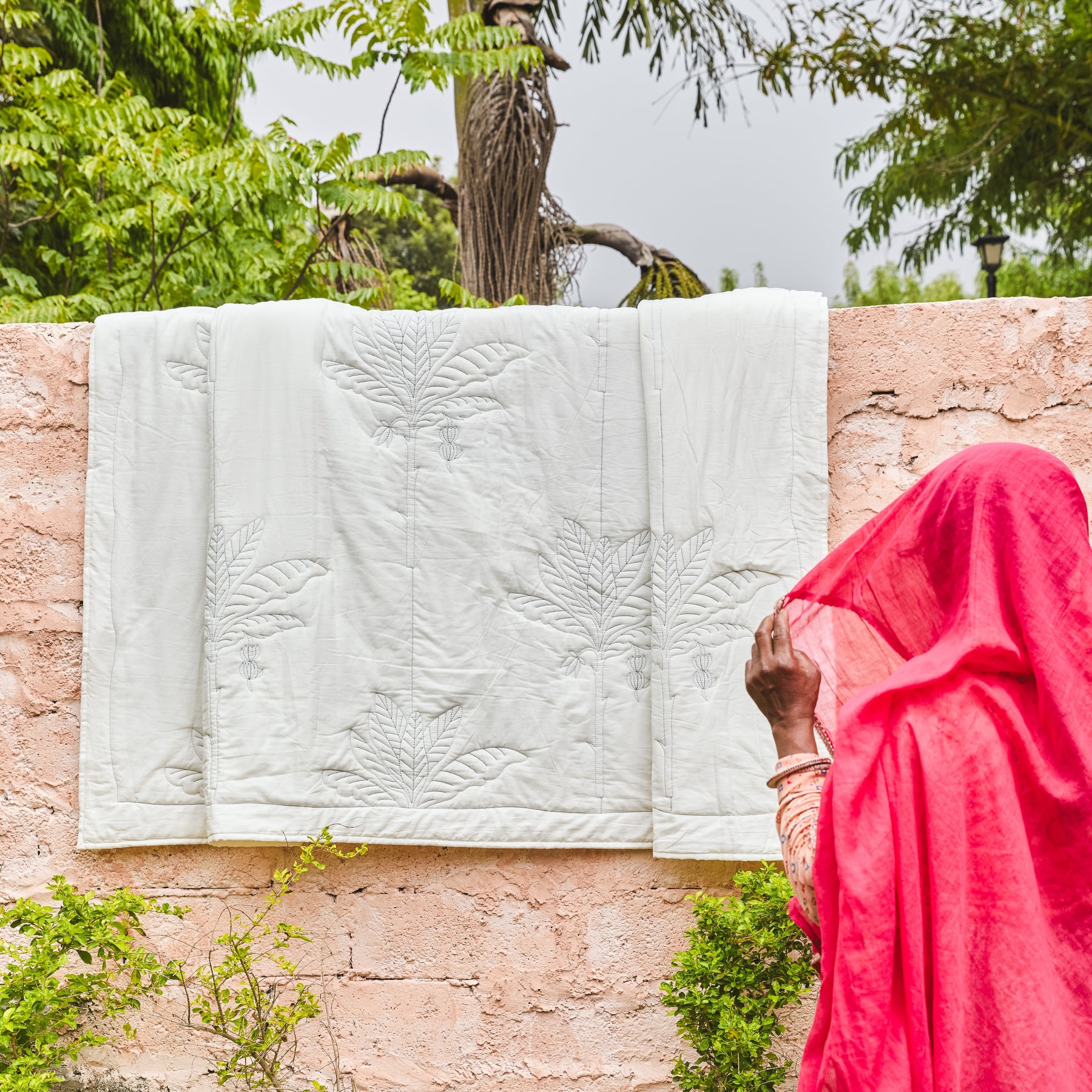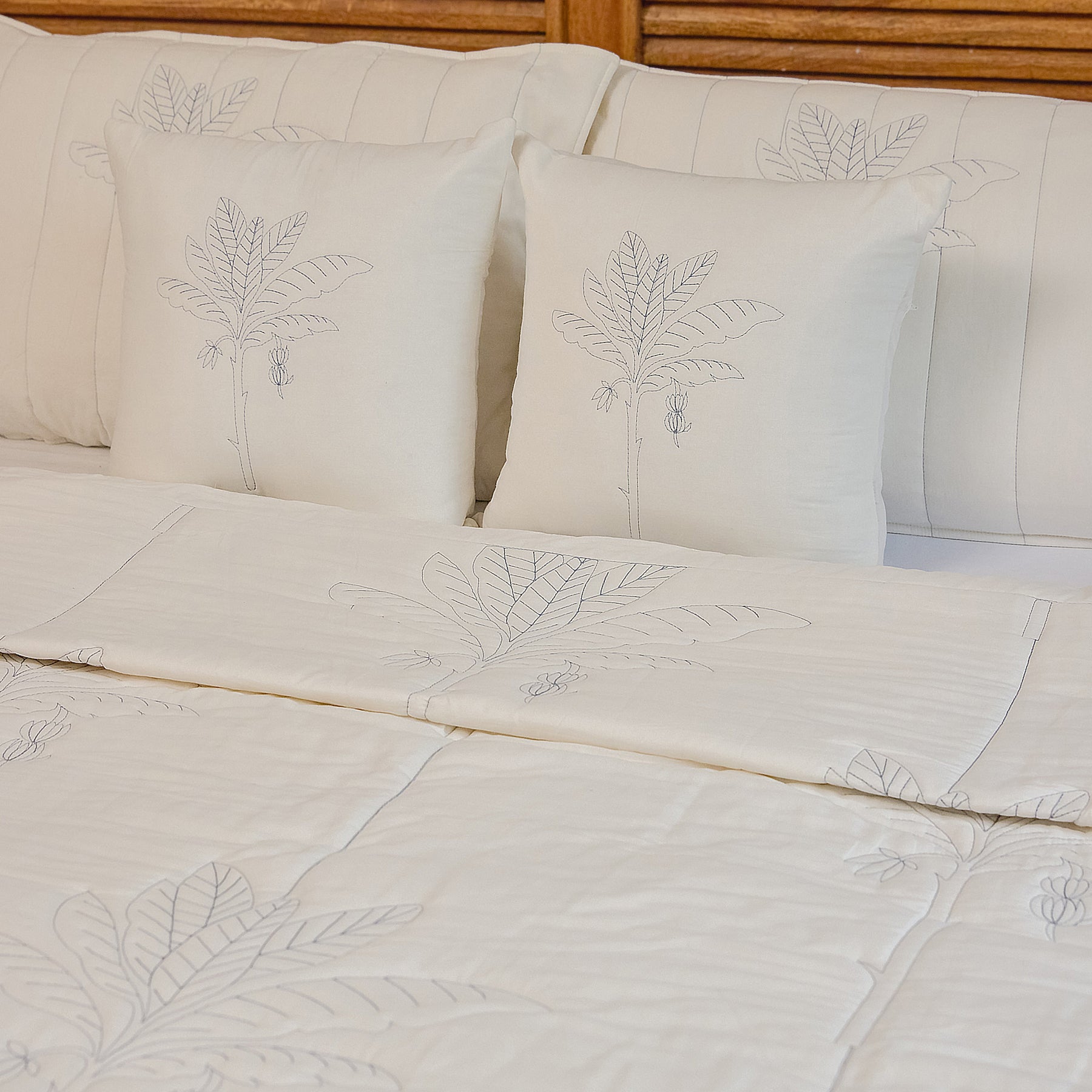 Quilts are a labour of love. Introducing brand new designs in our most favourite form of quilting. The tropical palm design has been hand sketched completely by our lead designer and then embroidered using soft quilting technique.