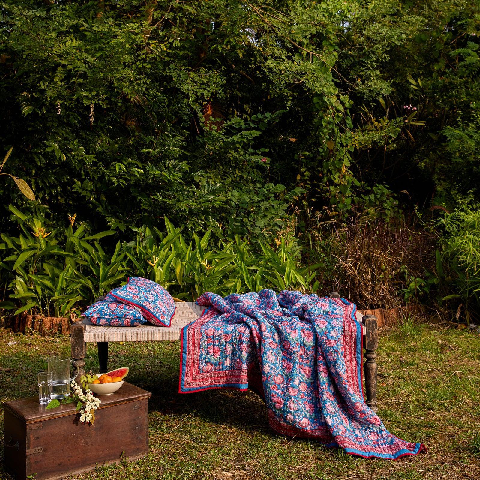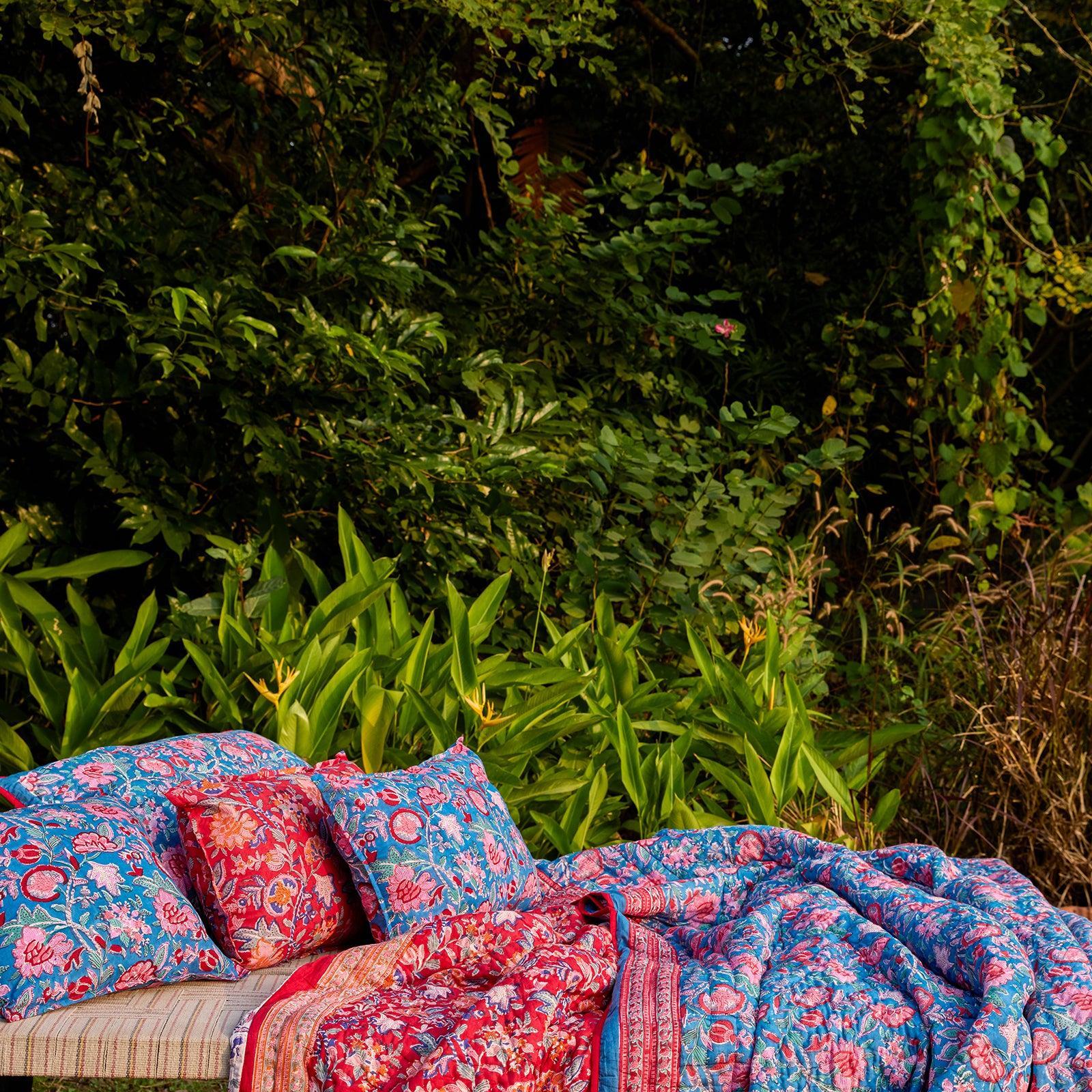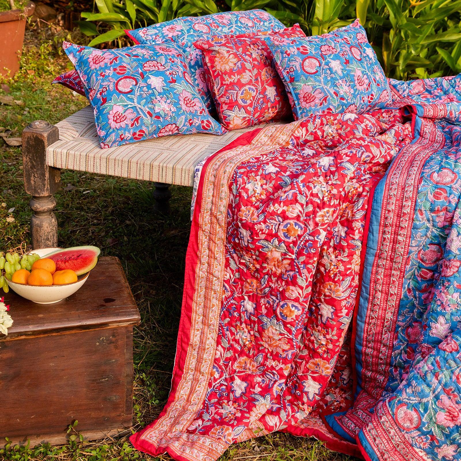 - Blockprinted by hand on 100% cotton mul, filled with cotton batting and hand quilted