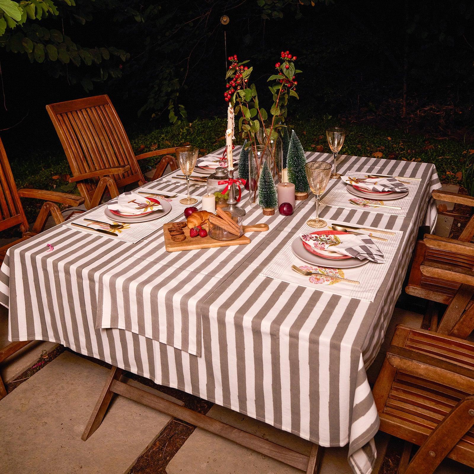 Elevate your dining table with this thoughtfully crafted table linen set from House of Ekam. The grey stripe table cloth is hand-block printed on 100% cotton canvas, offering a clean, timeless base that suits both everyday meals and special gatherings.