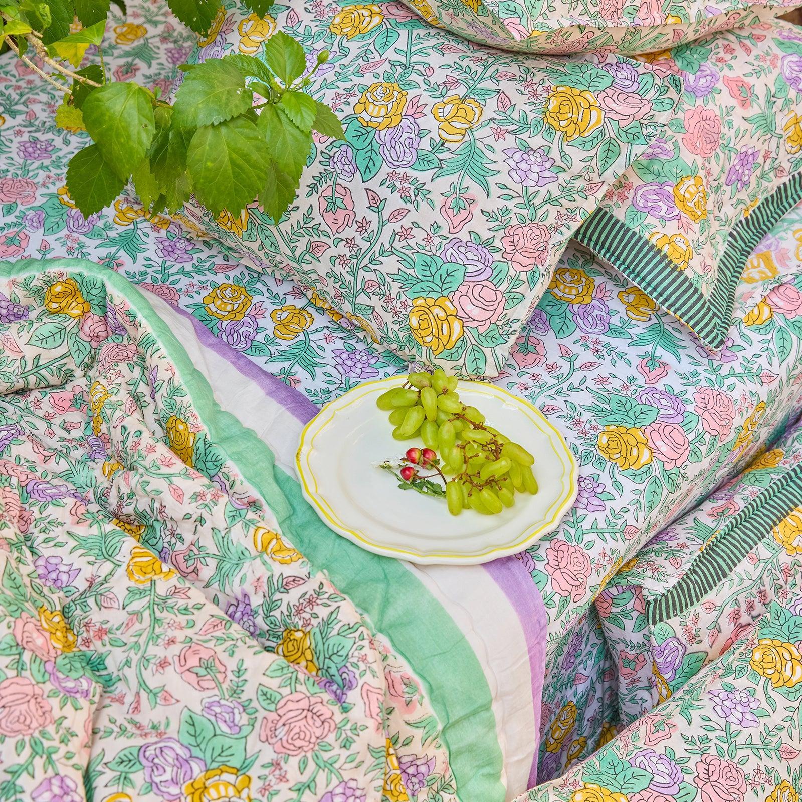 Bring a touch of old-world romance to your table with our Pink & Green Rose Cushion Covers, inspired by the timeless beauty of English rose gardens. Delicately hand block-printed, the floral motifs bloom in soft pastel pinks and gentle greens, creating an elegant yet soothing palette that elevates your bed in ways more than one.