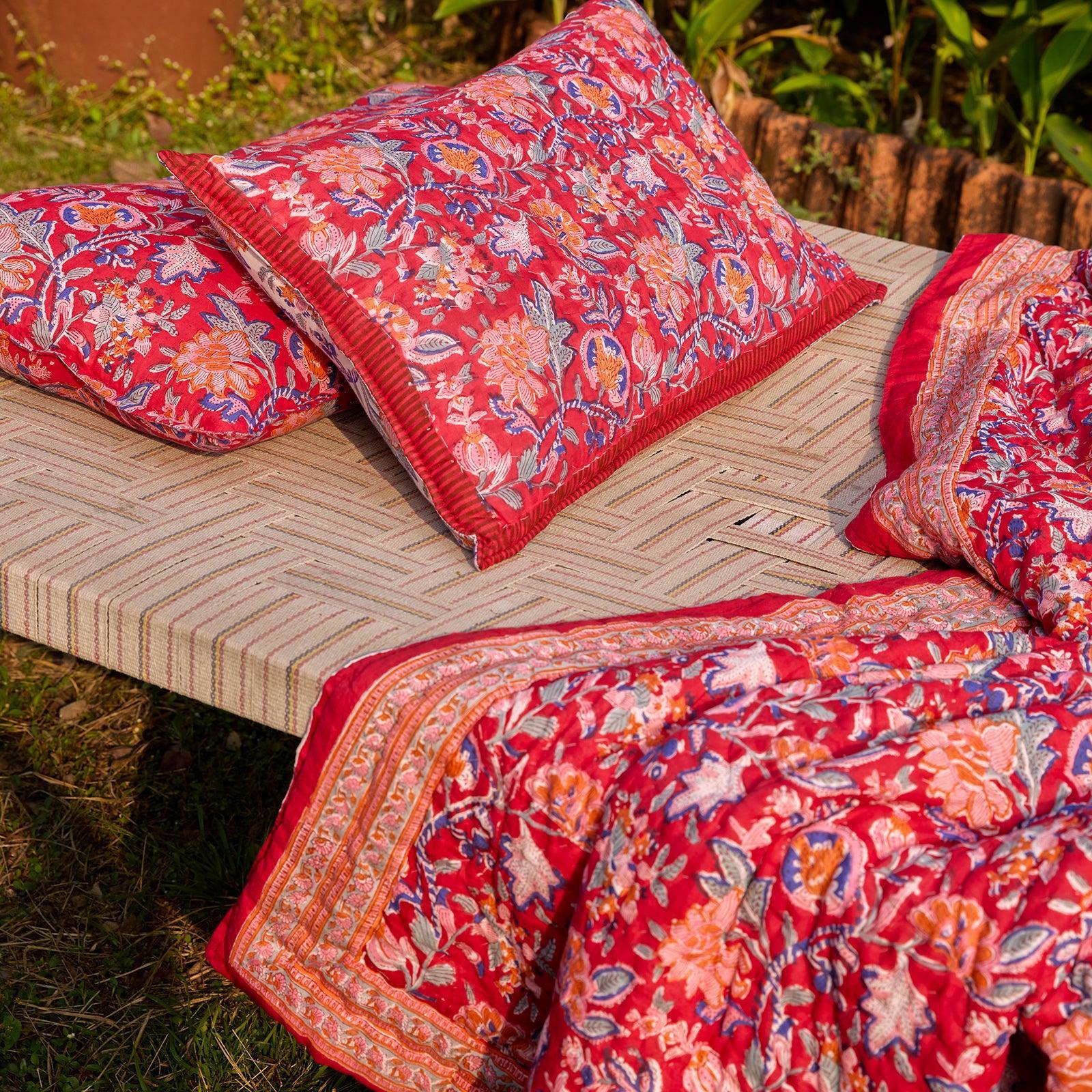 - Blockprinted by hand on 100% cotton mul, filled with cotton batting and hand quilted