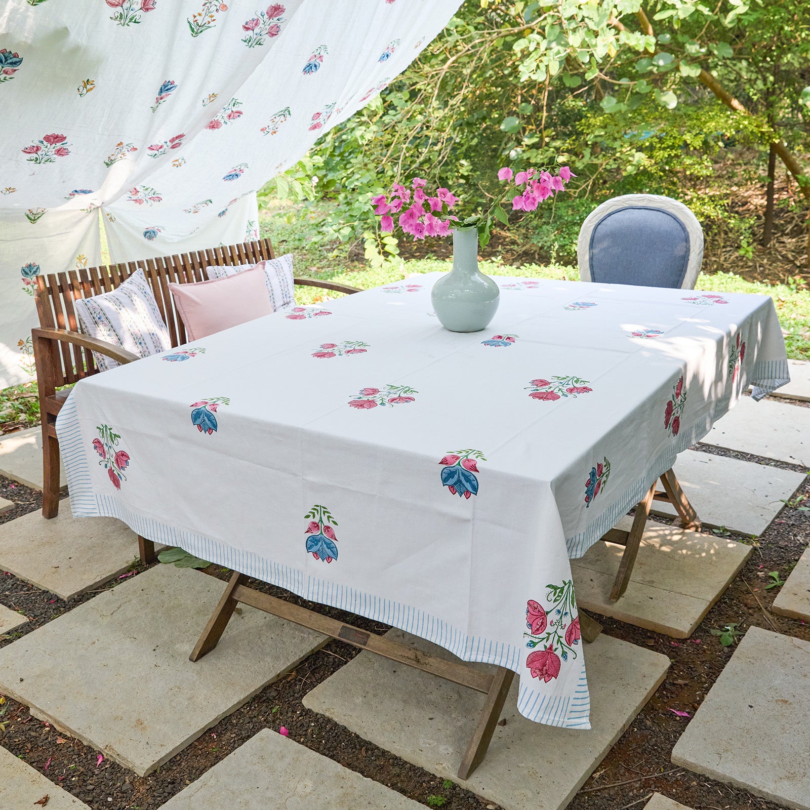Tarini unfolds across curtains, hand block-printed quilts, table linen, towels, bathrobes, and cushion covers. Every piece is meticulously handcrafted by skilled artisans in India, carrying forward generations of tradition, patience, and artistry.