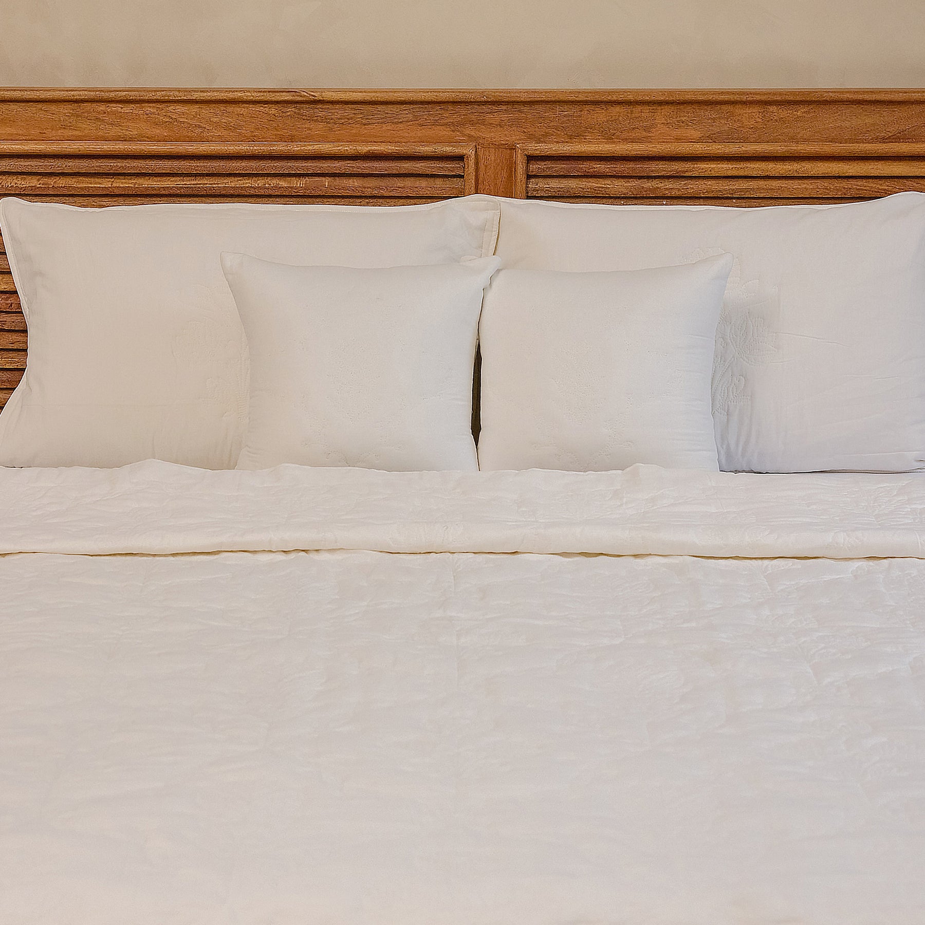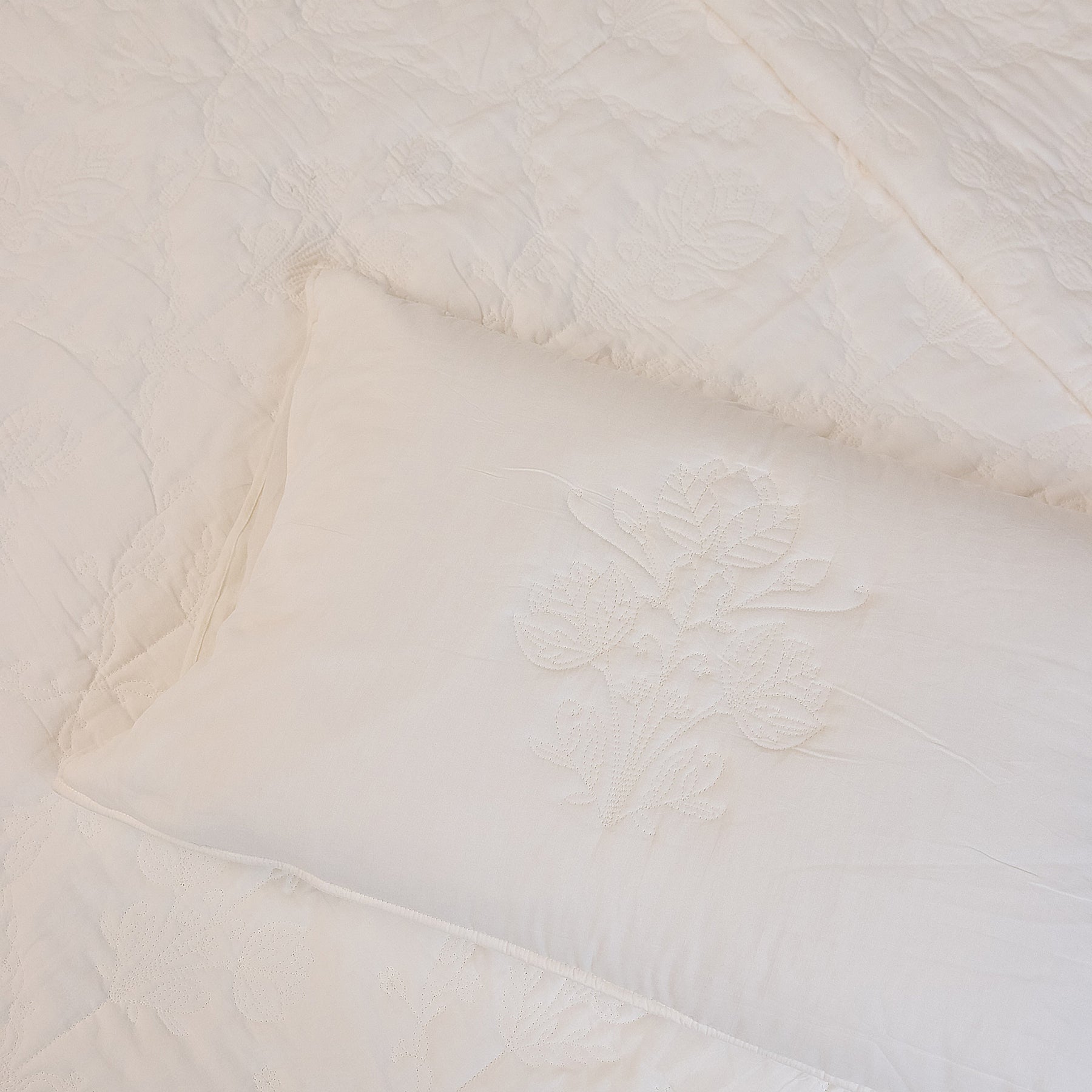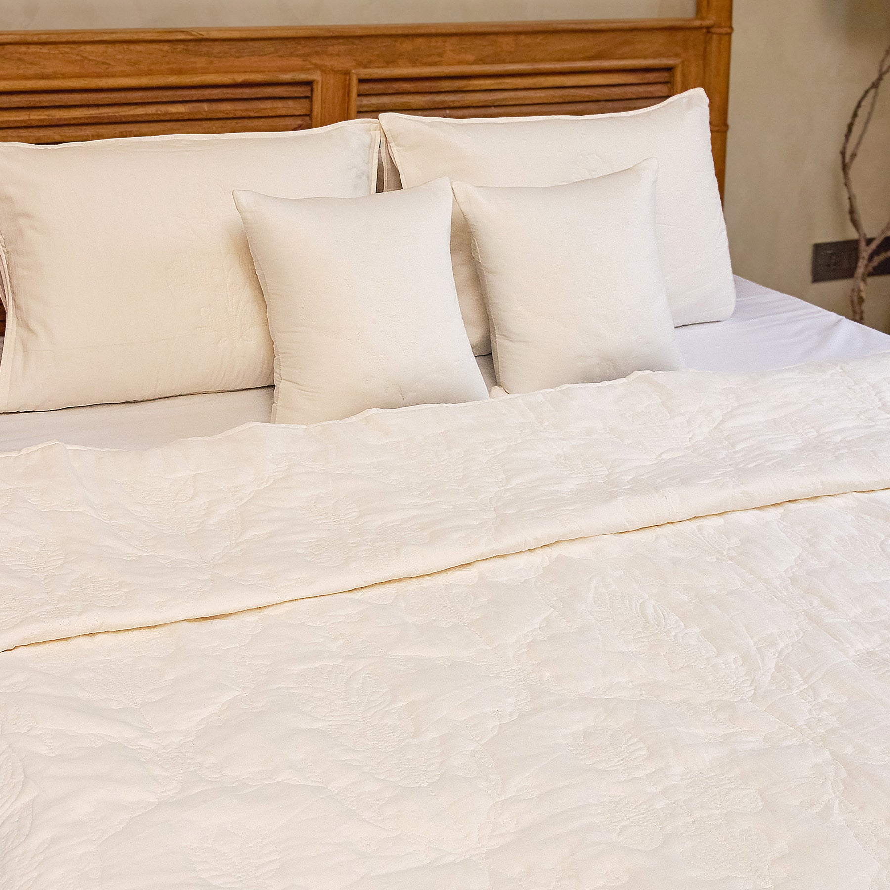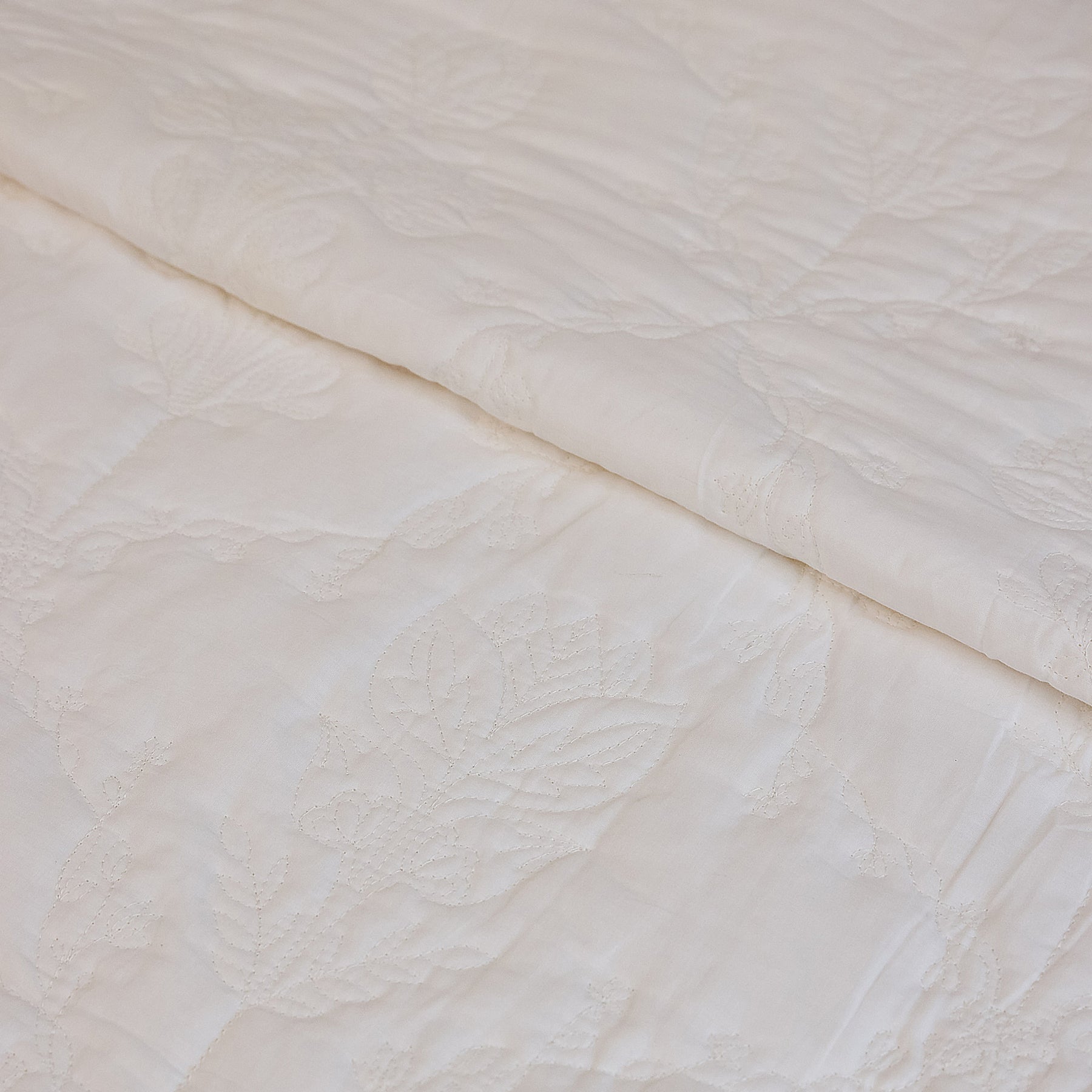 Quilts are a labour of love. Introducing brand new designs in our most favourite form of quilting. A timeless ode to heritage design, this quilt is adorned with delicate floral embroidery inspired by traditional chintz patterns. Each bloom and vine is intricately hand sketched, creating a garden-like tapestry that feels both nostalgic and refreshingly modern. Perfect for layering across seasons, it brings warmth, beauty, and a hint of vintage romance to any space."