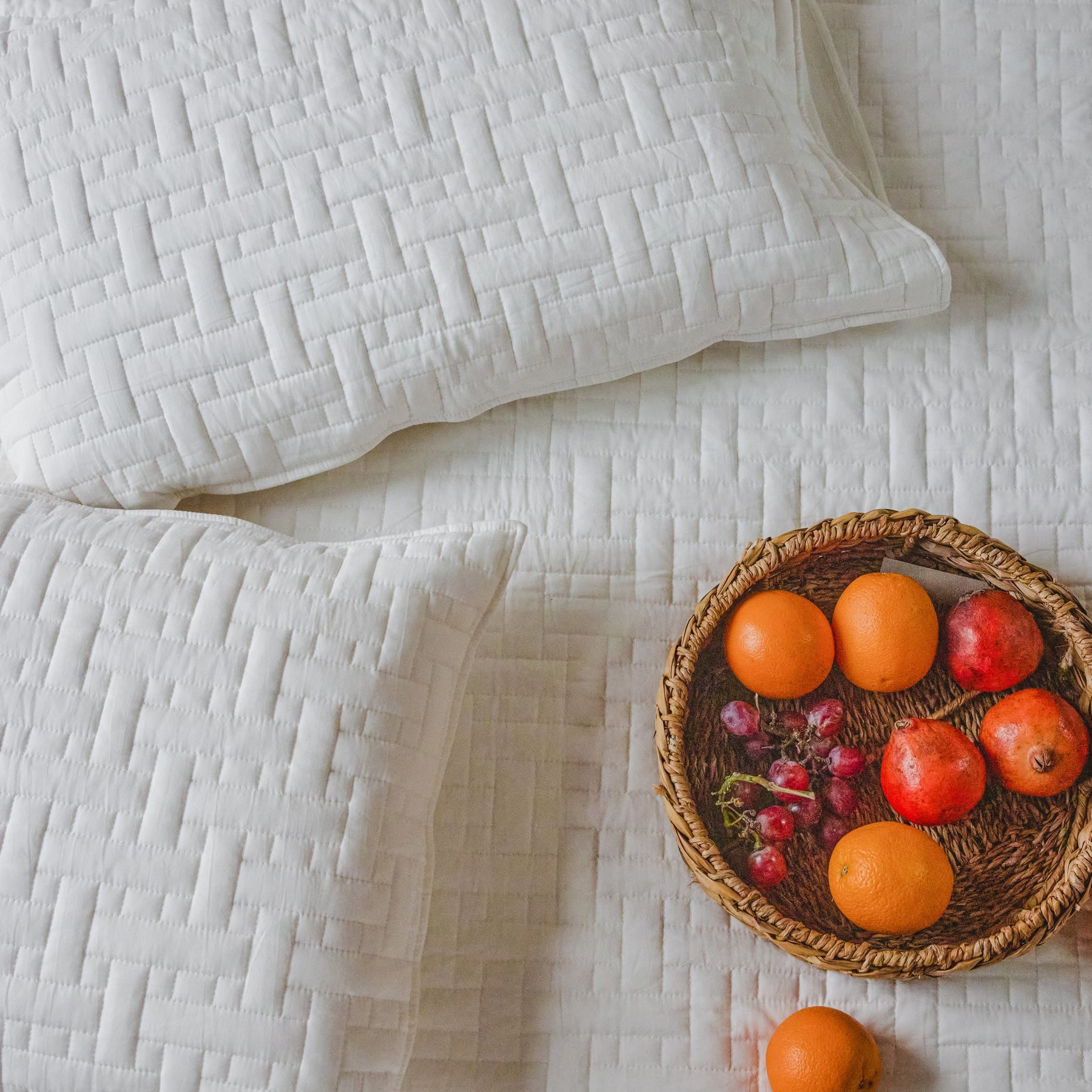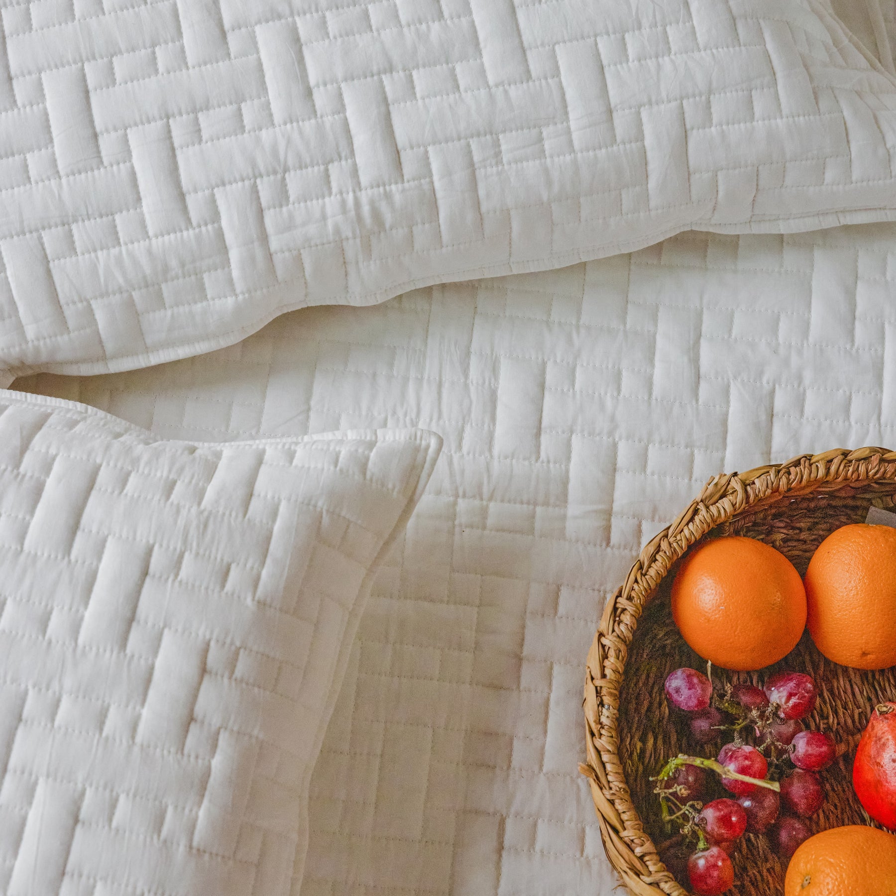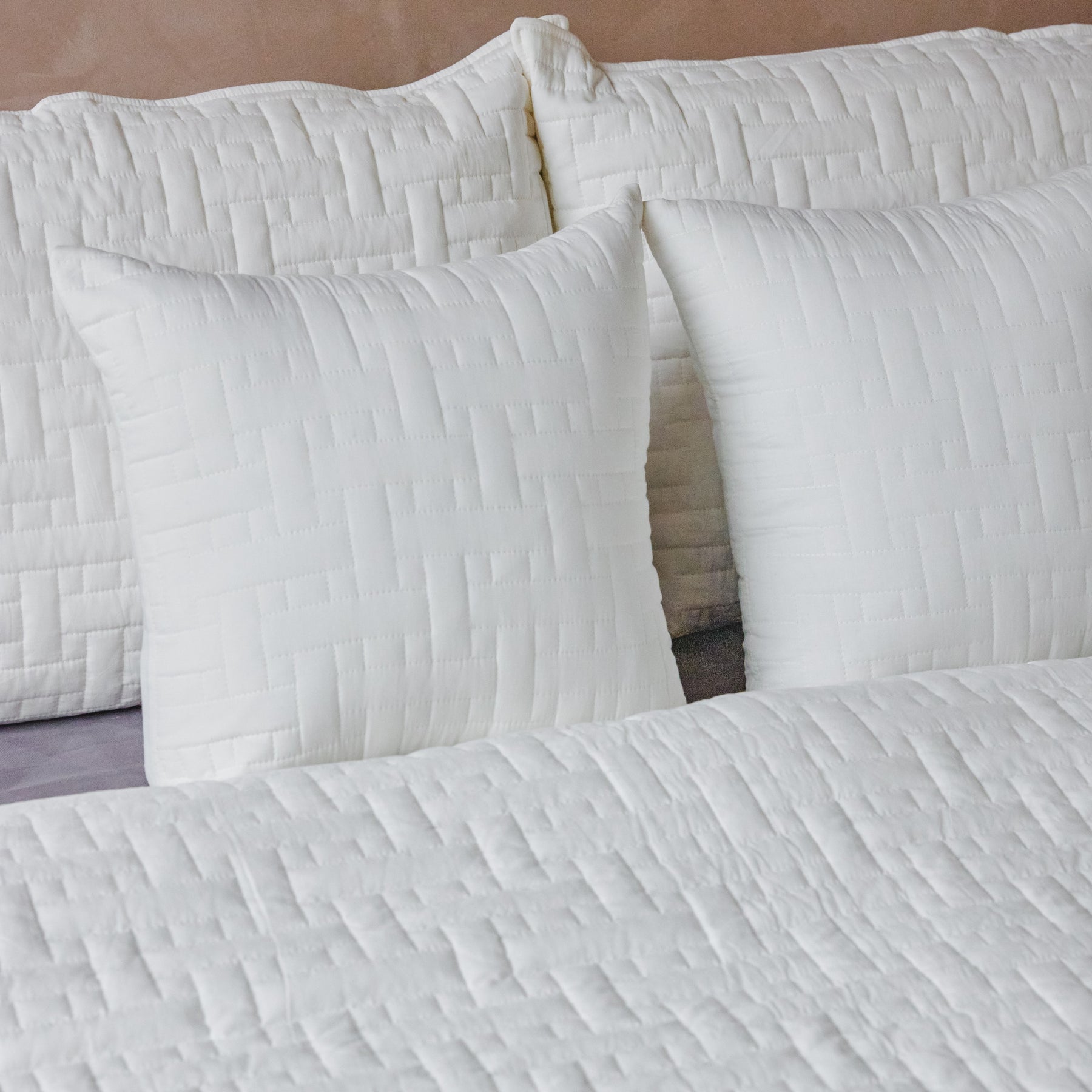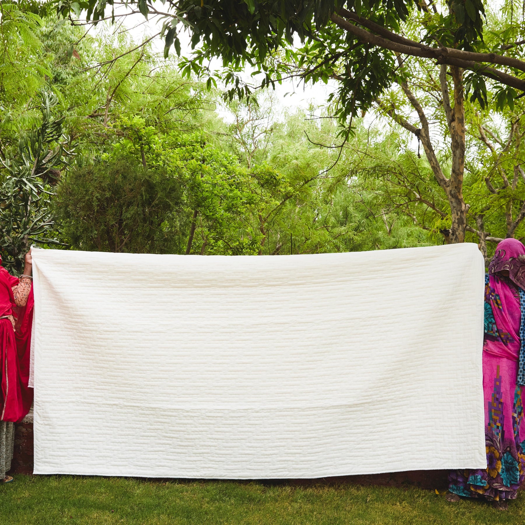 Quilts are a labour of love. Introducing brand new designs in our most favourite form of quilting. A modern abstract quilt featuring a subtle interlock pattern, executed in white-on-white for a clean, textural look. The design is created with precision computer embroidery, giving the quilt surface a delicate interplay of light and shadow while keeping the overall palette minimal and sophisticated