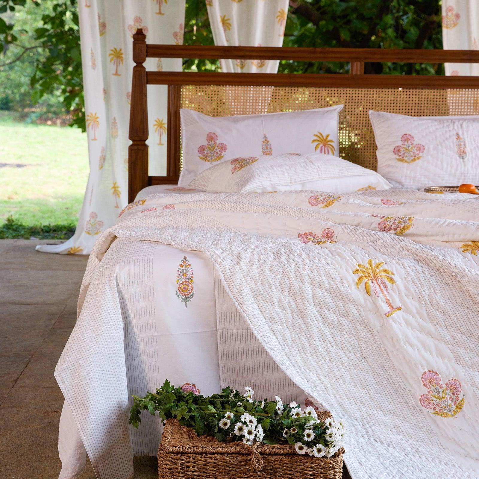 The Malabar Collection extends across bedsheets, quilts, cushions, curtains, bathrobes, and table linen, allowing the story to flow seamlessly through your home, from bedroom to bath to dining.