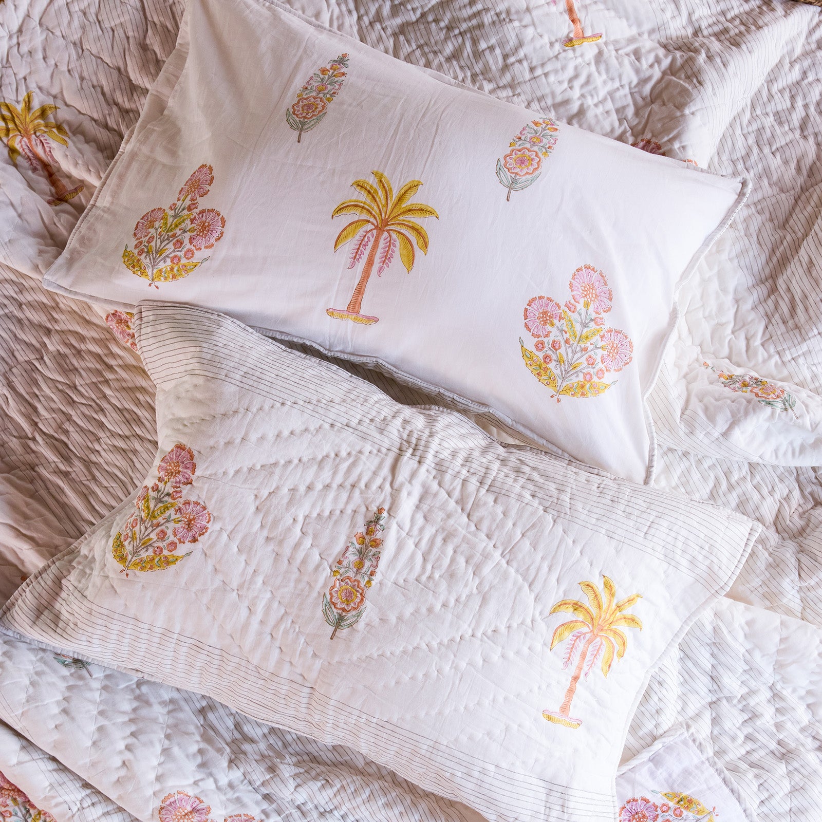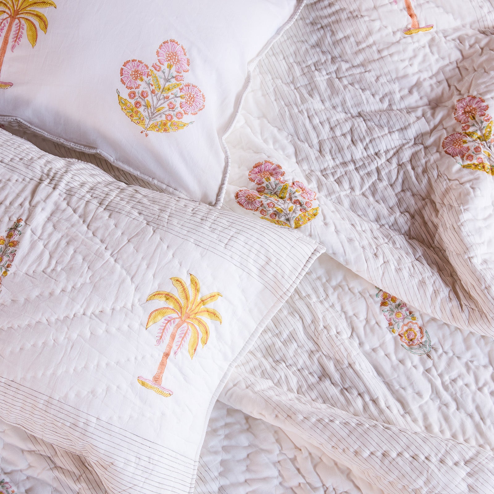 Rendered in beautiful hues of yellow and pink, the palette feels warm, joyful, and softly nostalgic, like early mornings by the sea and flowering courtyards washed in sunlight. Each piece is hand block-printed on 100% cotton, celebrating the rhythm, patience, and artistry of traditional craft.