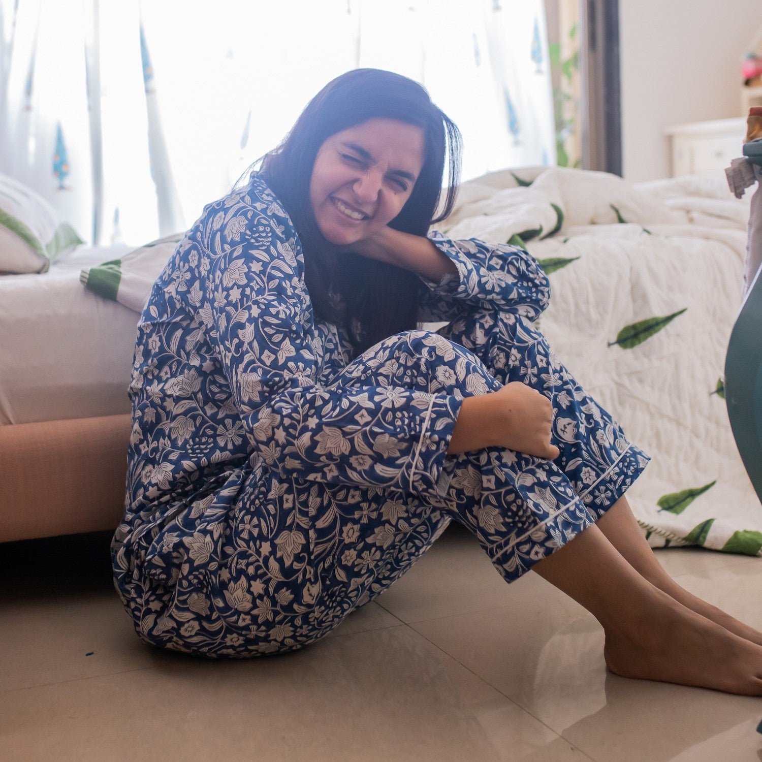 Unwind in style with our handblock printed floral loungewear set. Made by hand entirely, our indigo top and Pyjama set is super comfortable and comes in a relaxed fit with pockets